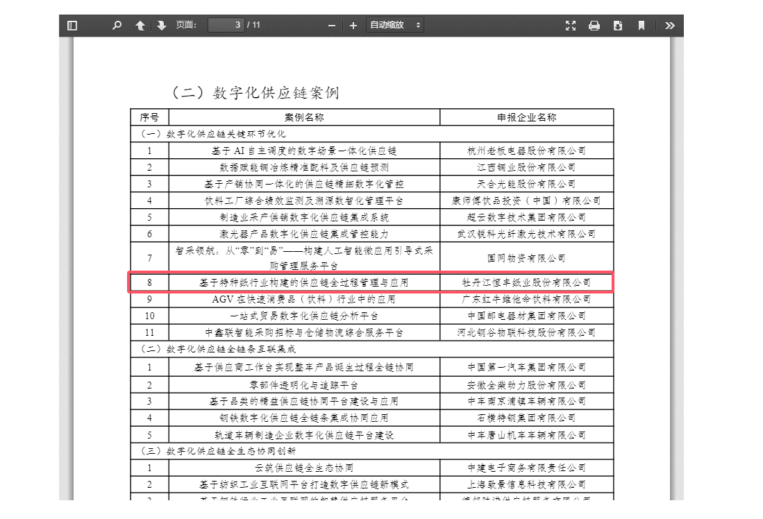 近日,工信部為深化實體經(jīng)濟與數(shù)字經(jīng)濟深度融合,啟動2024年典型案例征集工作,涵蓋數(shù)字化轉(zhuǎn)型通用工具產(chǎn)品、工業(yè)互聯(lián)網(wǎng)平臺創(chuàng)新領(lǐng)航應(yīng)用、數(shù)字領(lǐng)航企業(yè)實踐及數(shù)字化供應(yīng)鏈生態(tài)等方向。恒豐紙業(yè)申報的“基于特種紙行業(yè)構(gòu)建的供應(yīng)鏈全過程管理與應(yīng)用”成功入選“數(shù)字化供應(yīng)鏈生態(tài)”方向典型案例,成為全國30家入選企業(yè)之一,也是黑龍江省及造紙行業(yè)唯一代表。