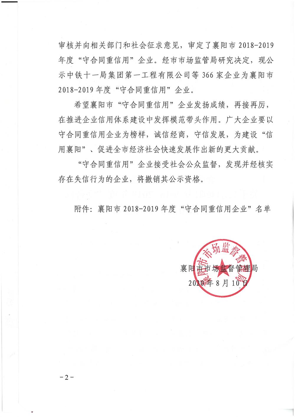2018-2019年度襄陽市“守合同重信用”企業(yè) 2020.9.17