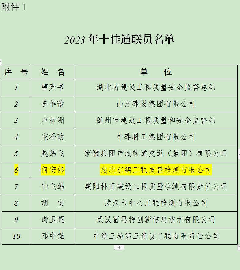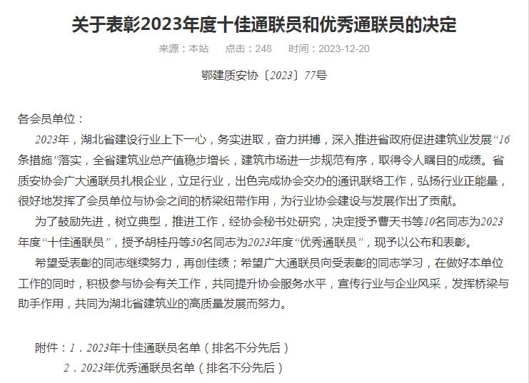 何總榮獲 湖北省建設工程質(zhì)量安全協(xié)會2023年度“十佳通聯(lián)員”
