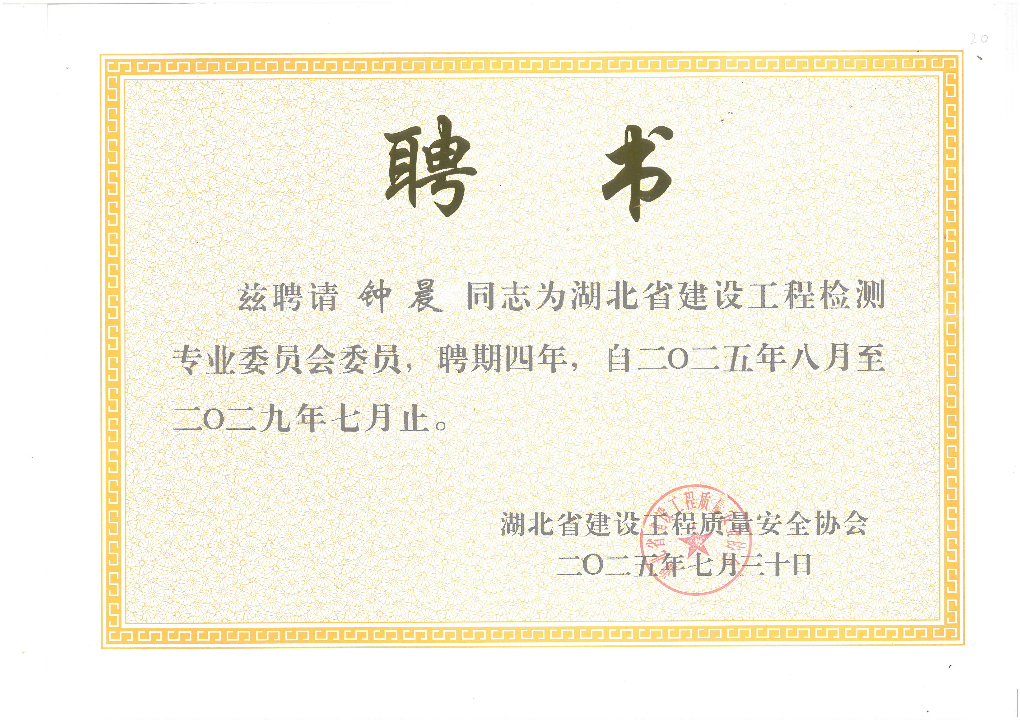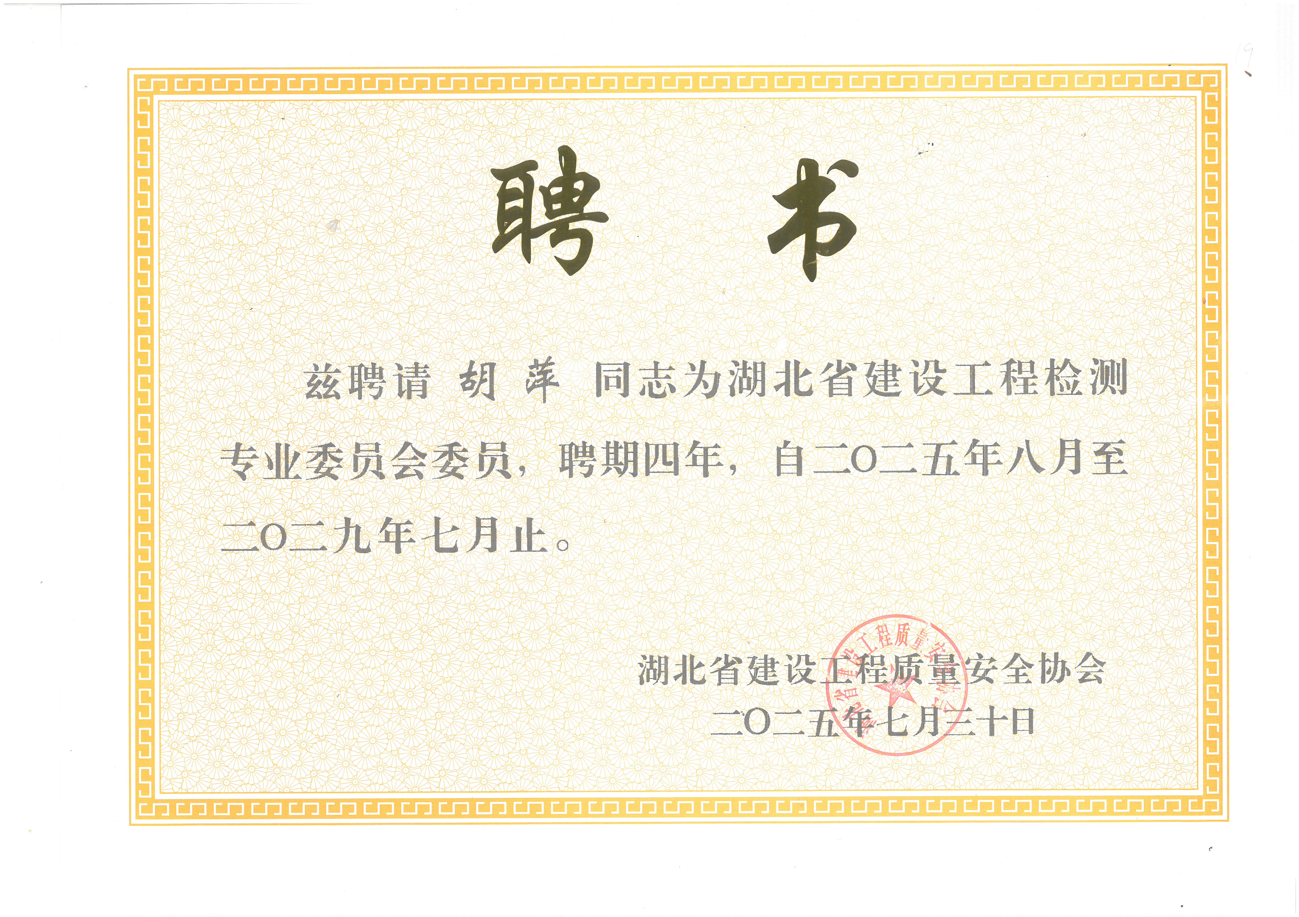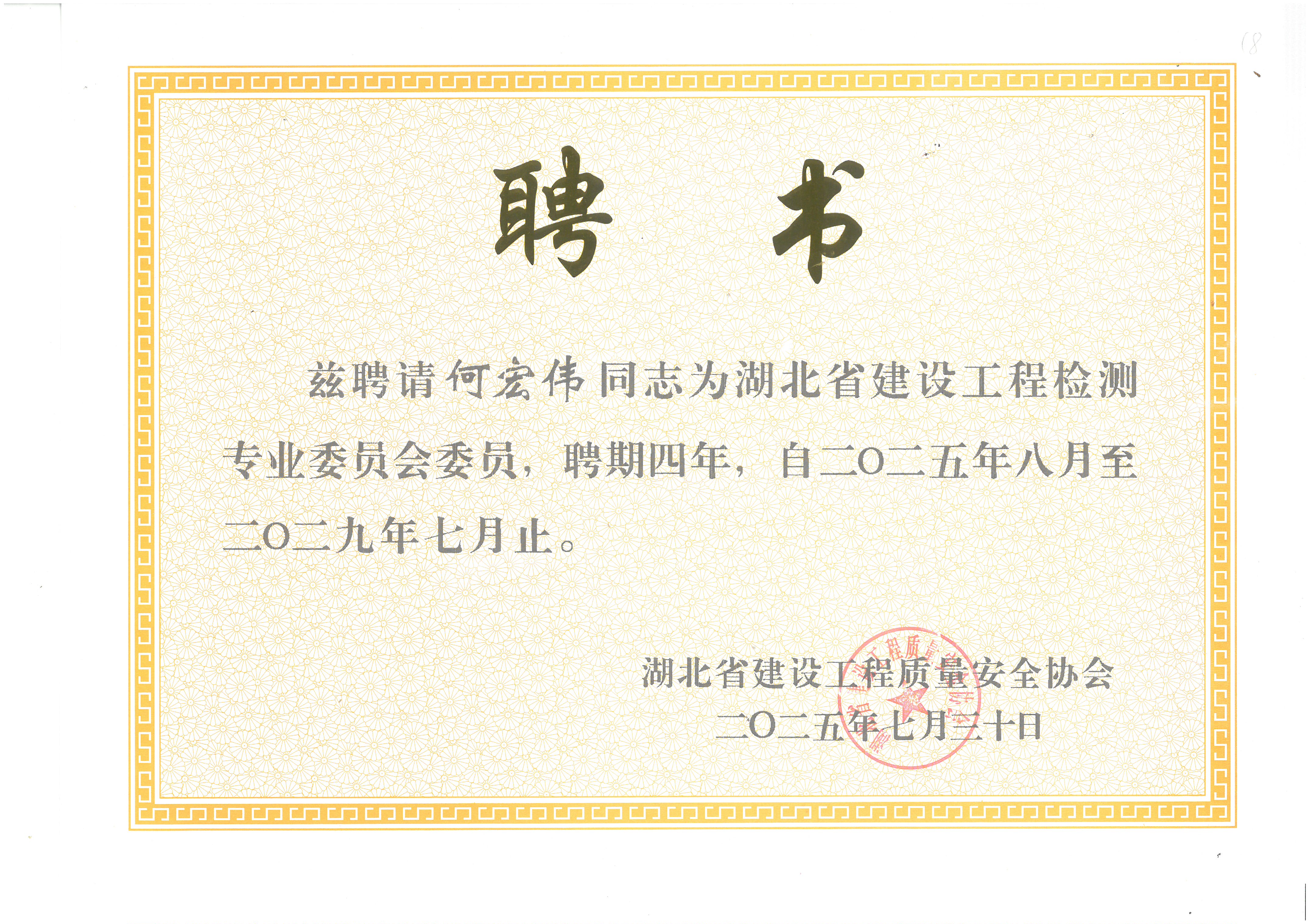 閱讀次數(shù):230 發(fā)布時間:2025年09月06日祝賀何總,胡萍總,鐘晨總,卜雄雄成為湖北省建設(shè)工程質(zhì)量安全協(xié)會專業(yè)委員會委員